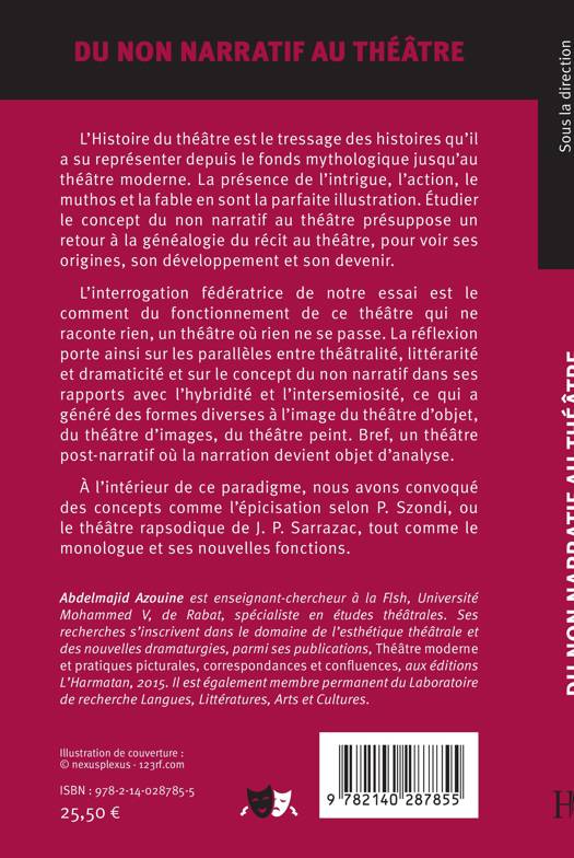 L'Histoire du théâtre est le tressage des histoires qu'il a su représenter depuis le fonds mythologique jusqu'au théâtre moderne. La présence de l'intrigue, l'action, le muthos et la fable en sont la parfaite illustration. Étudier le concept du non narratif au théâtre présuppose un retour à la généalogie du récit au théâtre, pour voir ses origines, son développement et son devenir. L'interrogation fédératrice de notre essai est le comment du fonctionnement de ce théâtre qui ne raconte rien, un théâtre où rien ne se passe. La réflexion porte ainsi sur les parallèles entre théâtralité, littérarité et dramaticité et sur le concept du non narratif dans ses rapports avec l'hybridité et l'intersemiosité, ce qui a généré des formes diverses à l'image du théâtre d'objet, du théâtre d'images, du théâtre peint. Bref, un théâtre post-narratif où la narration devient objet d'analyse. À l'intérieur de ce paradigme, nous avons convoqué des concepts comme l'épicisation selon P. Szondi, ou le théâtre rapsodique de J. P. Sarrazac, tout comme le monologue et ses nouvelles fonctions.