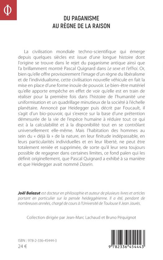 La civilisation mondiale techno-scientifique qui émerge depuis quelques siècles est issue d’une longue histoire dont l’origine se trouve dans le rejet du paganisme antique ainsi que l’a brillamment montré Pascal Quignard. Or, bien qu’elle offre provisoirement l’image d’un règne du libéralisme et de l’individualisme, cette civilisation nouvelle véhicule en fait la mise en place d’une forme inouïe de pouvoir. Le bien-être matériel qu’elle apporte empêche en effet de voir qu’elle est en train de réaliser pour la première fois dans l’histoire de l’humanité une uniformisation et un quadrillage minutieux de la société à l’échelle planétaire. Annoncé par Heidegger puis décrit par Foucault, il s’agit d’un bio-pouvoir, qui s’exerce sur la base d’une prétention démesurée de la vie de l’espèce humaine à réduire tout ce qui est à la calculabilité et à la disponibilité tout en se contrôlant universellement elle-même. Mais l’habitation des hommes au sein du « déjà là » de la nature, en leur finitude indépassable, en leurs particularités individuelles et en leur liberté, ne peut être totalement reniée et supprimée, de sorte qu’il leur sera toujours possible de regagner dans certaines limites, ce fond païen qui les définit originellement.