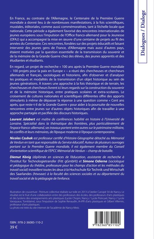 En France, au contraire de l'Allemagne, le centenaire de la Première Guerre mondiale a donné lieu à de nombreuses manifestations. Cette période a également favorisé des rencontres internationales de jeunes européens. Ces rencontres étaient motivées par la question essentielle de la transmission du souvenir et de la mémoire de la Grande Guerre chez des jeunes adultes. En regard, un projet de recherche a réuni des chercheurs allemands et français, afin d'observer et d'analyser les pratiques et modalités de la transmission d'un objet historique au sein de jeunes générations.