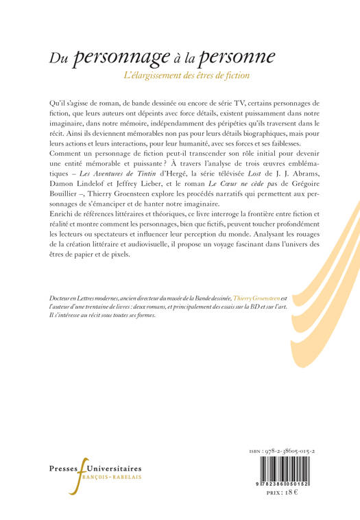 Damon Lindelof et Jeffrey Lieber, et le roman Le Coeur ne cède pas de Grégoire Bouillier –, Thierry Groensteen explore les procédés narratifs qui permettent aux personnages de s’émanciper et de hanter notre imaginaire. Enrichi de références littéraires et théoriques, ce livre interroge la frontière entre fiction et réalité et montre comment les personnages, bien que fictifs, peuvent toucher profondément les lecteurs ou spectateurs et influencer leur perception du monde. Analysant les rouages de la création littéraire et audiovisuelle, il propose un voyage fascinant dans l’univers des êtres de papier et de pixels.