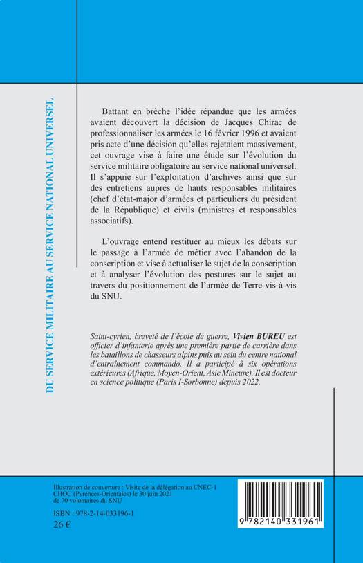 Battant en brèche l'idée répandue que les armées avaient découvert la décision de Jacques Chirac de professionnaliser les armées le 16 février 1996 et avaient pris acte d'une décision qu'elles rejetaient massivement, cet ouvrage vise à faire une étude sur l'évolution du service militaire obligatoire au service national universel. Il s'appuie sur l'exploitation d'archives ainsi que sur des entretiens auprès de hauts responsables militaires (chef d'état-major d'armées et particuliers du président de la République) et civils (ministres et responsables associatifs). L'ouvrage entend restituer au mieux les débats sur le passage à l'armée de métier avec l'abandon de la conscription et vise à actualiser le sujet de la conscription et à analyser l'évolution des postures sur le sujet au travers du positionnement de l'armée de Terre vis-à-vis du SNU.