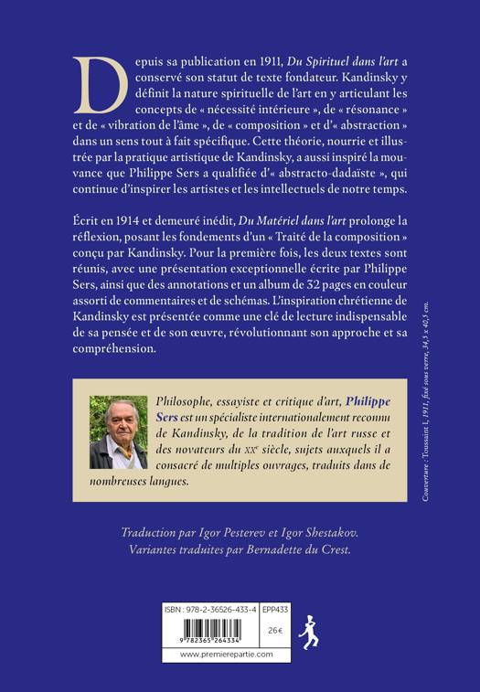 Depuis sa publication en 1911, Du Spirituel dans l'art a conservé son statut de texte fondateur. Kandinsky y définit la nature spirituelle de l'art en y articulant les concepts de « nécessité intérieure », de « résonance » et de « vibration de l'âme », de « composition » et d'« abstraction » dans un sens tout à fait spécifique. Cette théorie, nourrie et illustrée par la pratique artistique de Kandinsky, a aussi inspiré la mouvance que Philippe Sers a qualifiée d'« abstracto-dadaïste », qui continue d'inspirer les artistes et les intellectuels de notre temps. Écrit en 1914 et demeuré inédit, Du Matériel dans l'art prolonge la réflexion, posant les fondements d'un « Traité de la composition » conçu par Kandinsky. Pour la première fois, les deux textes sont réunis, avec une présentation exceptionnelle écrite par Philippe Sers, ainsi que des annotations et un album de 32 pages en couleur assorti de commentaires et de schémas.