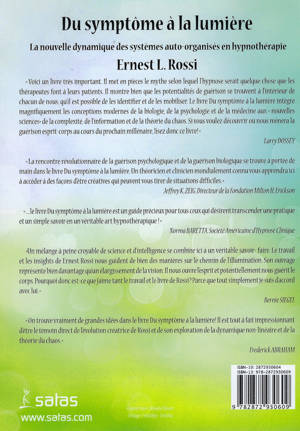 « Voici un livre très important. Il met en pièces le mythe selon lequel l’hypnose serait quelque chose que les thérapeutes font à leurs patients. Il montre bien que les potentialités de guérison se trouvent à l’intérieur de chacun de nous, qu’il est possible de les identifier et de les mobiliser. Le livre Du symptôme à la lumière intègre magnifiquement les conceptions modernes de la biologie, de la psychologie et de la médecine aux « nouvelles sciences» de la complexité, de l’information et de la théorie du chaos. Si vous voulez découvrir où nous mènera la guérison esprit-corps au cours du prochain millénaire, lisez donc ce livre! » Larry DOSSEY.