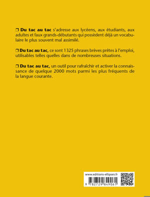 - Du tac au tac, ce sont 1325 phrases brèves prêtes à l’emploi, utilisables telles quelles dans de nombreuses situations.