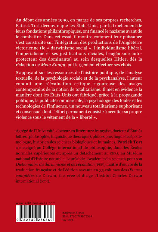 Patrick Tort montre comment les États-Unis ont construit leur puissance sur l’intégration des composantes de l’Angleterre victorienne (le « darwinisme social », l’individualisme libéral, l’impérialisme et ses justifications raciales et l’eugénisme auto-protecteur des dominants) au sein desquelles Hitler, dès la rédaction de Mein Kampf, put largement effectuer ses choix. À travers la planification eugéniste, son arsenal médico-législatif (Laughlin) et ses croisades racistes, antisémites et conspirationnistes (Ford), l’Amérique blanche a fourni à Hitler les pièces détachées de sa doctrine pour un montage « externalisé » dont les élaborations concrètes apparaîtront dès son accession au pouvoir. Ce passage à l’acte, rendu possible dans une Allemagne unifiée par la « mise au pas » des Länder, fut encouragé et salué par les voix les plus puissantes de l’eugénisme américain, reconnaissant volontiers sur un mode sincèrement admiratif que, dans cette réalisation, l’élève germanique avait dépassé le maître anglo-saxon, handicapé à cet égard par la disparité juridico-législative des États et le perpétuel souci de la constitutionnalité.