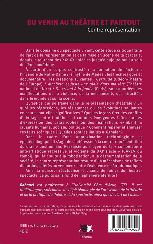 Dans le domaine du spectacle vivant, cette étude critique traite de l'art de la représentation et de la mise en scène de la barbarie, depuis le tournant des XXe-XXIe siècles jusqu'à aujourd'hui. À partir d'un corpus contrasté sont abordées les manifestations de la violence, de la méchanceté, des atrocités, dans le monde et sur la scène. Dans le cadre d'une approximation théâtrologique et épistémologique, il s'agit de s'intéresser à la contre-représentation du drame posthumain qui résulte d'un mécanisme de reflets distordus, altérés ou venimeux entre l'existence et l'art dramatique. Ainsi la noirceur réactualise le champ de ruines du théâtre-spectacle.