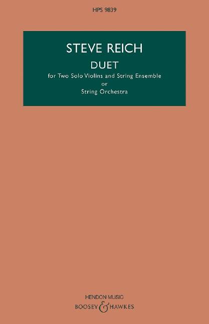 Composer’s note: “Duet was composed in 1994 and is dedicated to Yehudi Menuhin and to those ideals of international understanding which Sir Yehudi has practiced throughout his life. The piece is approximately five minutes in length. It is scored for two solo violins and a small group of violas, celli, and bass. Beginning and ending in F the music is built around simple unison canons between the two violins who, from time to time, slightly vary the rhythmic distance between their two voices.” Steve Reich Instrumentation: 2 violins and string Ensemble or string orchestra