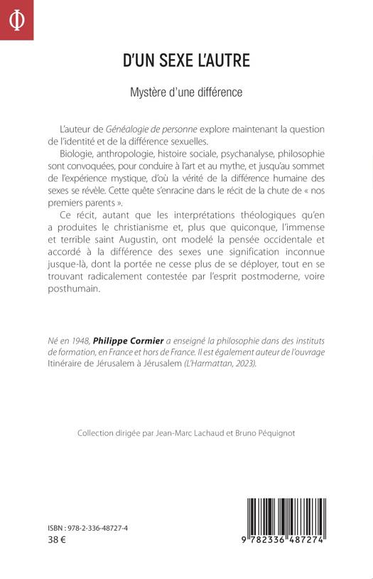 L’auteur de Généalogie de personne explore maintenant la question de l’identité et de la différence sexuelles. Biologie, anthropologie, histoire sociale, psychanalyse, philosophie sont convoquées, pour conduire à l’art et au mythe, et jusqu’au sommet de l’expérience mystique, d’où la vérité de la différence humaine des sexes se révèle. Cette quête s’enracine dans le récit de la chute de « nos premiers parents ». Ce récit, autant que les interprétations théologiques qu’en a produites le christianisme et, plus que quiconque, l’immense et terrible saint Augustin, ont modelé la pensée occidentale et accordé à la différence des sexes une signification inconnue jusque-là, dont la portée ne cesse plus de se déployer, tout en se trouvant radicalement contestée par l’esprit postmoderne, voire posthumain.
