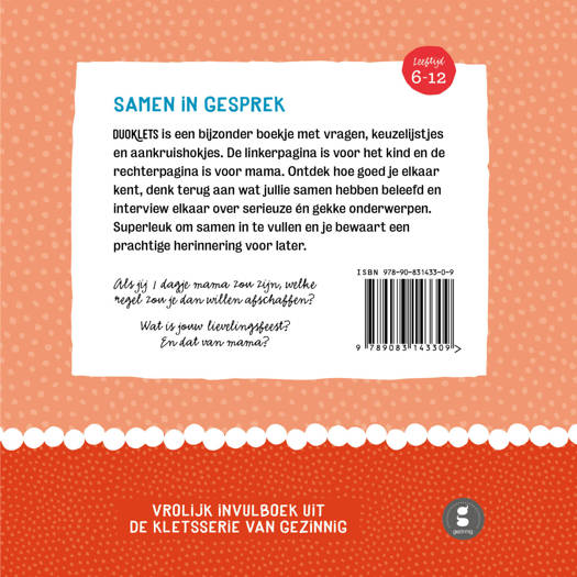 Vrolijk invulboek uit de kletsserie van Gezinnig. Samen in gesprek met Duoklets: een bijzonder boekje met vragen, keuzelijstjes en aankruishokjes. Elke linkerpagina is voor het kind en elke rechterpagina is voor mama. Als jij 1 dagje mama zou zijn, welke regel zou je dan willen afschaffen? Wat is jouw lievelingsfeest? En dat van mama? Ontdek hoe goed je elkaar kent, denk terug aan wat jullie samen hebben beleefd en interview elkaar over serieuze én gekke onderwerpen. Superleuk om samen in te vullen en je bewaart een prachtige herinnering voor later. Geschikt voor kinderen van 6 tot 12 jaar.