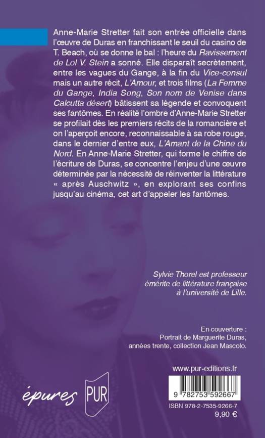 Anne-Marie Stretter fait son entrée officielle dans l’oeuvre de Duras en franchissant le seuil du casino de T. Beach, où se donne le bal : l’heure du Ravissement de Lol V. Stein a sonné. Elle disparaît secrètement, entre les vagues du Gange, à la fin du Vice-consul mais un autre récit, L’Amour, et trois films (La Femme du Gange, India Song, Son nom de Venise dans Calcutta désert) bâtissent sa légende et convoquent ses fantômes. En réalité l’ombre d’Anne-Marie Stretter se profilait dès les premiers récits de la romancière et on l’aperçoit encore, reconnaissable à sa robe rouge, dans le dernier d’entre eux, L’Amant de la Chine du Nord. En Anne-Marie Stretter, qui forme le chiffre de l’écriture de Duras, se concentre l’enjeu d’une oeuvre déterminée par la nécessité de réinventer la littérature « après Auschwitz », en explorant ses confins jusqu’au cinéma, cet art d’appeler les fantômes.