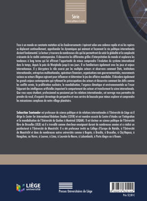 Un décryptage du rôle exercé par les multiples acteurs jouant un rôle sur la scène internationale : Etats, institutions, entreprises multinationales, opérateurs financiers, ONG, mouvements sociaux. L'évolution des relations internationales depuis la paix de Westphalie ainsi que les enjeux contemporains, comme les conflits armés, la prolifération nucléaire ou l'urgence climatique, sont analysés.
