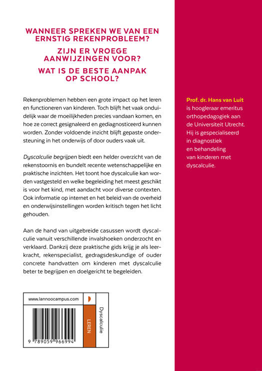 Wanneer spreken we van een ernstig rekenprobleem? Zijn er vroege aanwijzingen voor? Wat is de beste aanpak op school? Rekenproblemen hebben een grote impact op het leren en functioneren van kinderen. Toch blijft het vaak onduidelijk waar de moeilijkheden precies vandaan komen, en hoe ze correct gesignaleerd en gediagnosticeerd kunnen worden. Zonder voldoende inzicht blijft gepaste ondersteuning in het onderwijs of door ouders vaak uit. Dyscalculie begrijpen biedt een helder overzicht van de rekenstoornis en bundelt recente wetenschappelijke en praktische inzichten. Het toont hoe dyscalculie kan worden vastgesteld en welke begeleiding het meest geschikt is voor het kind, met aandacht voor diverse contexten. Ook informatie op internet en het beleid van de overheid en onderwijsinstellingen worden kritisch tegen het licht gehouden. Aan de hand van uitgebreide casussen en voorbeelden wordt dyscalculie vanuit verschillende invalshoeken onderzocht en verklaard. Dankzij deze praktische gids krijg je als leerkracht, rekenspecialist, gedragsdeskundige of ouder concrete handvatten om kinderen met dyscalculie beter te begrijpen en doelgericht te begrijpen.