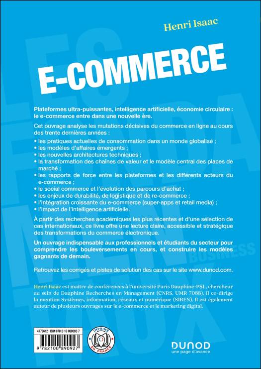 Plateformes ultra-puissantes, intelligence artificielle, économie circulaire : le e-commerce entre dans une nouvelle ère. Cet ouvrage analyse les mutations décisives du commerce en ligne au cours des trente dernières années, en mettant l’accent sur les ruptures les plus récentes : • les pratiques actuelles de consommation dans un monde globalisé ; • les modèles d’affaires émergents ; • les nouvelles architectures techniques ; • la transformation des chaînes de valeur et le modèle central des places de marché ; • les rapports de force entre les plateformes et les différents acteurs du e-commerce ; • le social commerce et l’évolution des parcours d’achat ; • les enjeux de durabilité, de logistique et de re-commerce ; • l’intégration croissante du e-commerce (super-apps et retail media) ; • l’impact de l’intelligence artificielle. À partir des recherches académiques les plus récentes et d’une sélection de cas internationaux, ce livre offre une lecture claire, accessible et stratégique des transformations du commerce électronique. Un ouvrage indispensable aux professionnels et étudiants du secteur pour comprendre les bouleversements en cours, et construire les modèles gagnants de demain.