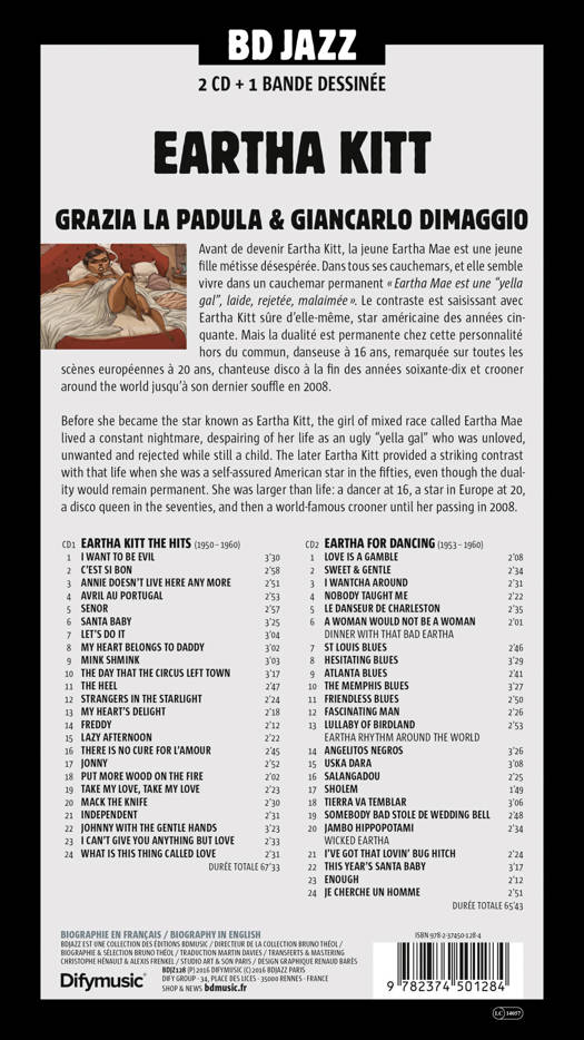 Une biographie d'Eartha Kitt, illustrée par Grazia la Padula et accompagnée de 2 compact discs.<br /><br /> Avant de devenir Eartha Kitt, la jeune Eartha Mae est une jeune fille métisse désespérée. Dans tous ses cauchemars, et elle semble vivre dans un cauchemar permanent, « Eartha Mae est une “yella gal”, laide, rejetée, malaimée ». Le contraste est saisissant avec Eartha Kitt sûre d’elle-même, star américaine des années cinquante. Mais la dualité est permanente chez cette personnalité hors du commun, danseuse à 16 ans, remarquée sur toutes les scènes européennes à 20 ans, chanteuse disco à la fin des années soixante-dix et crooner around the world jusqu’à son dernier souffle en 2008.<br /><br /><br /> Before she became the star known as Eartha Kitt, the girl of mixed race called Eartha Mae lived a constant nightmare, despairing of her life as an ugly "yella gal" who was unloved, unwanted and rejected while still a child. The later Eartha Kitt provided a striking contrast with that life when she was a self-assured American star in the Fifties, even though the duality would remain permanent. She was larger than life: a dancer at 16, a star in Europe at 20, a disco queen in the Seventies, and then a world-famous crooner until her passing in 2008.<br /><br />