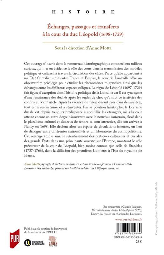 Cet ouvrage s’inscrit dans le renouveau historiographique consacré aux milieux curiaux, qui met en évidence le rôle des cours dans la transmission des modèles politique et culturel, à travers la circulation des élites. Parce qu’elle appartient à un État frontalier situé entre France et Empire, la cour de Lunéville offre un observatoire privilégié pour étudier les phénomènes migratoires ainsi que les échanges entre les différents espaces auliques. Le règne de Léopold (1697-1729) fait figure d’exception dans l’histoire politique de la Lorraine car il est synonyme d’une renaissance des duchés après les ondes de choc qu’a subi ce territoire des confins au XVIIe siècle. Après la vacance du trône durant près d’un demi-siècle, tout est à reconstruire et à réinventer. Par sa position limitrophe, la Lorraine ducale est depuis toujours prédisposée à accueillir les étrangers, mais la cour atteint encore un autre degré d’ouverture avec le nouveau souverain, élevé dans le pluralisme culturel et désireux de rendre sa cour attractive, dès son arrivée à Nancy en 1698. Elle devient alors un espace de circulations intenses, un lieu de dialogue entre différentes nationalités et un laboratoire du cosmopolitisme. Cet ouvrage étudie ainsi le retentissement des pratiques culturelles et curiales des grands États dans une principauté ouverte sur l’Europe, montrant le rôle précurseur de la cour de Léopold, bien moins connue que celle de Stanislas (1737-1766), dans la diffusion des premières Lumières à l’Est du royaume de France.