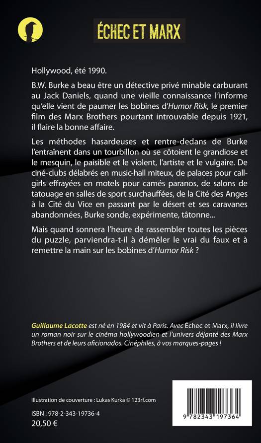 film des Marx Brothers pourtant introuvable depuis 1921, il flaire la bonne affaire. De ciné-clubs délabrés en music-hall miteux, de palaces pour callgirls effrayées en motels pour camés paranos, de salons de tatouage en salles de sport surchauffées, de la Cité des Anges à la Cité du Vice en passant par le désert et ses caravanes abandonnées, Burke sonde, expérimente, tâtonne. Mais quand sonnera l'heure de rassembler toutes les pièces du puzzle, parviendra-t-il à démêler le vrai du faux et à remettre la main sur les bobines d'Humor Risk ?