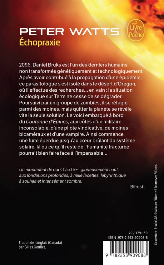 2096. Daniel Brüks est l’un des derniers humains non transformés génétiquement et technologiquement. Après avoir contribué à la propagation d’une épidémie, ce parasitologue s’est isolé dans le désert d’Oregon, où il effectue des recherches… en vain : la situation écologique sur Terre ne cesse de se dégrader. Poursuivi par un groupe de zombies, il se réfugie parmi des moines, mais quitter la planète se révèle vite la seule solution. Le voici embarqué à bord du Couronne d’épines, aux côtés d’un militaire inconsolable, d’une pilote vindicative, de moines bicaméraux et d’une vampire. Ainsi commence une fuite éperdue jusqu’au cœur brûlant du Système solaire, là où ce qu’il reste de l’humanité fracturée pourrait bien faire face à l’impensable…