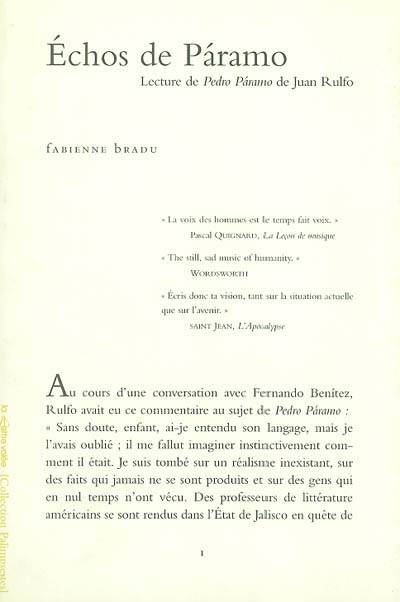 Rares sinon inexistants sont les essais en français portant sur l'oeuvre de l'écrivain mexicain Juan Rulfo, dont l'influence sur le roman latino-américain de la seconde moitié de ce siècle aura été considérable. L'essai de Fabienne Bradu éclaire l'originalité profonde de son maître livre, Pedro Páramo, dont Carlos Fuentes disait qu'il était «la plus haute expression à laquelle soit parvenu jusqu'à maintenant le roman mexicain: à travers Pedro Páramo, nous pouvons trouver le fil qui nous conduit au nouveau roman latino-américain et à sa relation avec les problèmes que pose la prétendue crise internationale du roman.»