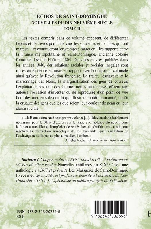 Les textes compris dans ce volume exposent, de différentes façons et de divers points de vue, les souvenirs et hantises qui ont marqué les rapports entre la France métropolitaine et Saint-Domingue, ancienne colonie française devenue Haïti en 1804. Dans ces oeuvres, publiées dans les années 1840, des relations raciales et sociales inégales sont mises en évidence et mises en rapport avec l'occupation coloniale.