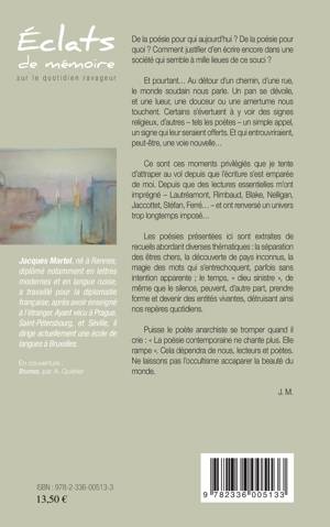 Les poésies présentées ici sont extraites de recueils abordant diverses thématiques : la séparation des êtres chers, la découverte de pays inconnus, la magie des mots qui s'entrechoquent, parfois sans intention apparente ; le temps, « dieu sinistre », de même que le silence, peuvent, d'autre part, prendre forme et devenir des entités vivantes, détruisant ainsi nos repères quotidiens. (J.M.)