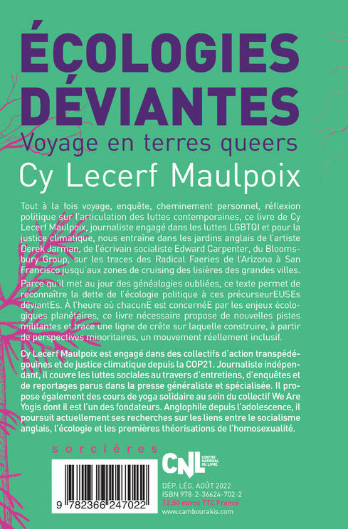Tout à la fois voyage, enquête, cheminement personnel, réflexion politique sur l'articulation des luttes contemporaines, ce livre de Cy Lecerf Maulpoix, journaliste engagé dans les luttes LGBTQI et pour la justice climatique, nous entraîne dans les jardins anglais de l'artiste Derek Jarman, de l'écrivain socialiste Edward Carpenter, du Bloomsbury Group, sur les traces des Radical Faeries de l'Arizona à San Francisco jusqu'aux zones de cruising des lisières des grandes villes.