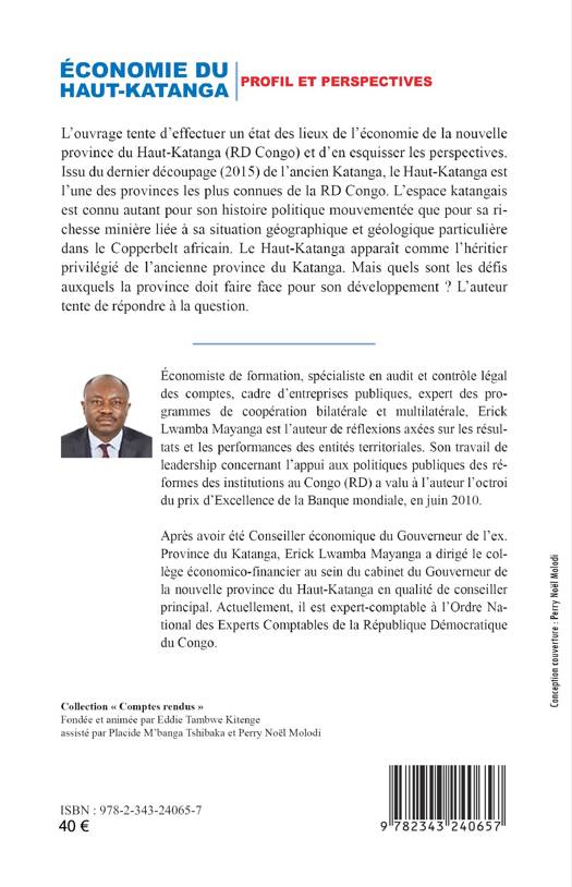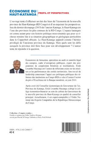L'ouvrage tente d'effectuer un état des lieux de l'économie de la nouvelle province du Haut-Katanga (RD Congo) et d'en esquisser les perspectives. Issu du dernier découpage (2015) de l'ancien Katanga, le Haut-Katanga est l'une des provinces les plus connues de la RD Congo. L'espace katangais est connu autant pour son histoire politique mouvementée que pour sa richesse minière liée à sa situation géographique et géologique particulière dans le Copperbelt africain. Le haut-Katanga apparaît comme l'héritier privilégié de l'ancienne province du Katanga. Mais quels sont les défis auxquels la province doit faire face pour son développement ?