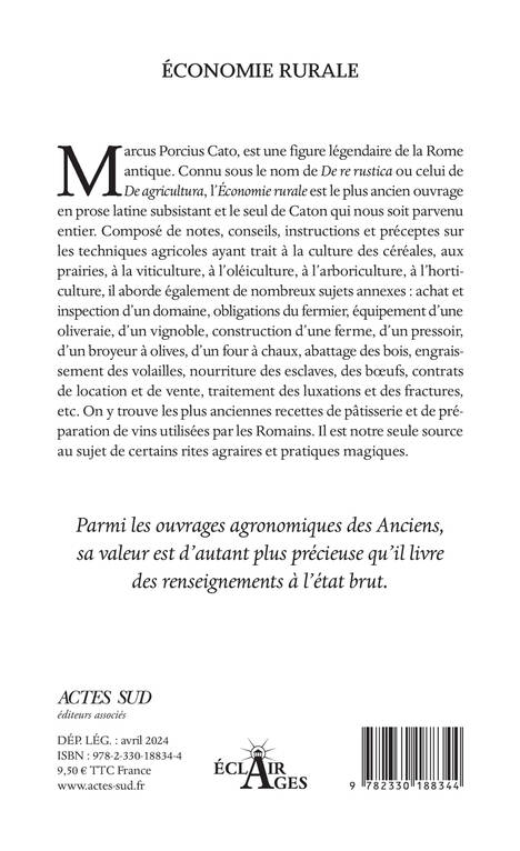 Marcus Porcius Cato, est une figure légendaire de la Rome antique. Connu sous le nom de De re rustica ou celui de De agricultura, l'Économie rurale est le plus ancien ouvrage en prose latine subsistant et le seul de Caton qui nous soit parvenu entier. Composé de notes, conseils, instructions et préceptes sur les techniques agricoles ayant trait à la culture des céréales, aux prairies, à la viticulture, à l'oléiculture, à l'arboriculture, à l'horticulture, il aborde également de nombreux sujets annexes : achat et inspection d'un domaine, obligations du fermier, équipement d'une oliveraie, d'un vignoble, construction d'une ferme, d'un pressoir, d'un broyeur à olives, d'un four à chaux, abattage des bois, engraissement des volailles, nourriture des esclaves, des boeufs, contrats de location et de vente, traitement des luxations et des fractures, etc. On y trouve les plus anciennes recettes de pâtisserie et de préparation de vins utilisées par les Romains. Il est notre seule source au sujet de certains rites agraires et pratiques magiques.