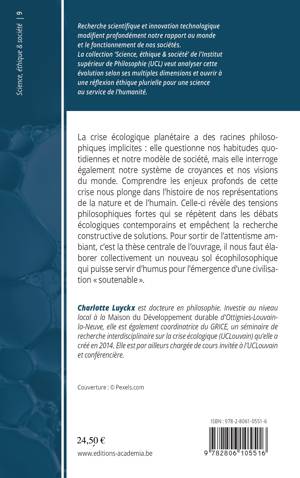 La crise écologique planétaire a des racines philosophiques fortes elle questionne nos habitudes, notre modèle de société, mais également notre système de croyances et nos représentations du monde. Comprendre les enjeux profonds de cette crise nous plonge dans l'histoire de nos représentations de la nature et de l'humain. À l'attentisme ambiant, l'auteure oppose l'élaboration collective d'un nouveau sol écophilosophique qui serve d'humus pour l'émergence d'une civilisation soutenable.