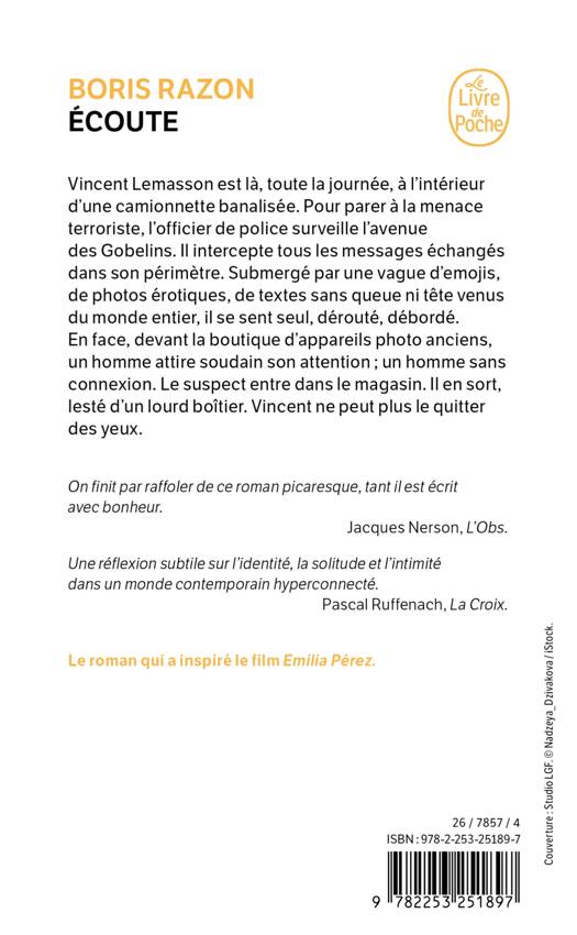 Vincent Lemasson est là, toute la journée, à l’intérieur d’une camionnette banalisée. Pour parer à la menace terroriste, l’officier de police surveille l’avenue des Gobelins. Il intercepte tous les messages échangés dans son périmètre. Submergé par une vague d’emojis, de photos érotiques, de textes sans queue ni tête venus du monde entier, il se sent seul, dérouté, débordé. En face, devant la boutique d’appareils photo anciens, un homme attire soudain son attention  ; un homme sans connexion. Le suspect entre dans le magasin. Il en sort, lesté d’un lourd boîtier. Vincent ne peut plus le quitter des yeux.
