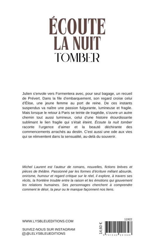 Julien s'envole vers Formentera avec, pour seul bagage, un recueil de Prévert. Dans la file d'embarquement, son regard croise celui d'Élise, une jeune femme au port de reine. De ces instants suspendus va naître une passion fulgurante, lumineuse et fragile. Mais lorsque le retour à Paris se teinte de tragédie, s'ouvre un autre chemin tout aussi lumineux, celui d'une histoire étourdissante sublimant le lien fragile qui s'était éteint. Écoute la nuit tomber raconte l'urgence d'aimer et la beauté déchirante des commencements arrachés au destin. C'est aussi une ode aux vies qui se réinventent dans la sensualité, au-delà du souvenir.