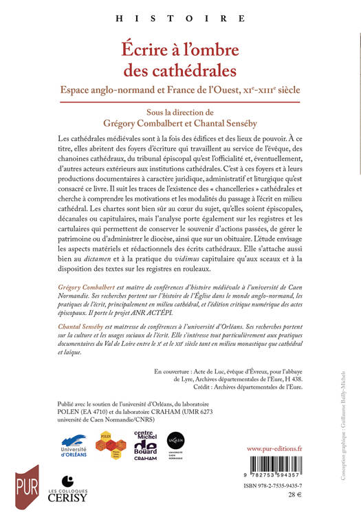 Les cathédrales médiévales sont à la fois des édifices et des lieux de pouvoir. À ce titre, elles abritent des foyers d’écriture qui travaillent au service de l’évêque, des chanoines cathédraux, du tribunal épiscopal qu’est l’officialité et, éventuellement, d’autres acteurs extérieurs aux institutions cathédrales. C’est à ces foyers et à leurs productions documentaires à caractère juridique, administratif et liturgique qu’est consacré ce livre. Il suit les traces de l’existence des « chancelleries » cathédrales et cherche à comprendre les motivations et les modalités du passage à l’écrit en milieu cathédral. Les chartes sont bien sûr au coeur du sujet, qu’elles soient épiscopales, décanales ou capitulaires, mais l’analyse porte également sur les registres et les cartulaires qui permettent de conserver le souvenir d’actions passées, de gérer le patrimoine ou d’administrer le diocèse, ainsi que sur un obituaire. L’étude envisage les aspects matériels et rédactionnels des écrits cathédraux. Elle s’attache aussi bien au dictamen et à la pratique du vidimus capitulaire qu’aux sceaux et à la disposition des textes sur les registres en rouleaux.