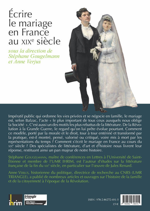 Impératif public qui ordonne les vies privées et se négocie en famille, le mariage est, selon Balzac, l'acte « le plus important de tous ceux auxquels nous oblige la Société ». C'est aussi un des motifs les plus rebattus de la littérature. De la Révolution à la Grande Guerre, le regard qu'on lui prête évolue pourtant. Comment ce modèle, porté par la morale et le droit, tour à tour entériné et transformé par la pratique, est-il montré, pensé, valorisé ou critiqué, voire mis à mort par les représentations du temps ? Comment s'écrit le mariage en France au cours du XIXe siècle ? Des spécialistes de littérature, d'art et d'histoire nous livrent leur réponse, restituant ainsi un pan majeur de notre histoire.