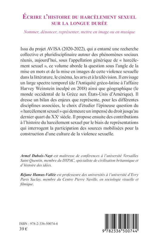 Issu du projet AVISA (2020-2022), qui a entamé une recherche collective et pluridisciplinaire autour des phénomènes sociaux réunis, aujourd'hui, sous l'appellation générique de harcèlement sexuel, ce volume aborde la question sous l'angle de la mise en mots et de la mise en images de cette violence sexuelle dans la littérature, le cinéma, les arts et à la télévision. Il envisage un large spectre temporel (de l'Antiquité gréco-latine à l'affaire Harvey Weinstein inculpé en 2018) ainsi que géographique (le monde occidental de la Grèce aux États-Unis d'Amérique). Il dresse un bilan des enjeux que représente, pour les différentes disciplines associées, le choix d'étudier l'épineuse question du harcèlement sexuel qui demeure un impensé du droit jusqu'au dernier quart du XXe siècle. Il propose ensuite des contributions à l'histoire du harcèlement sexuel par le biais de représentations qui interrogent la participation des sources mobilisées pour la construction d'une culture de la violence sexuelle.