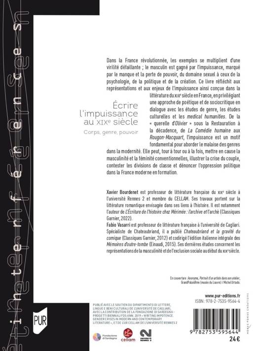 Avec le soutien du dipatimento di lettere lingue e beni culturali de l'Université de Cagliari, avec la contribution de la Fondazione di Sardegna-Progetti Biennali FDS Ann.2019 "Writing impotence. Gender crises in modern and contemporary litterature", et de UR CELLAM de l'Université de Rennes 2.