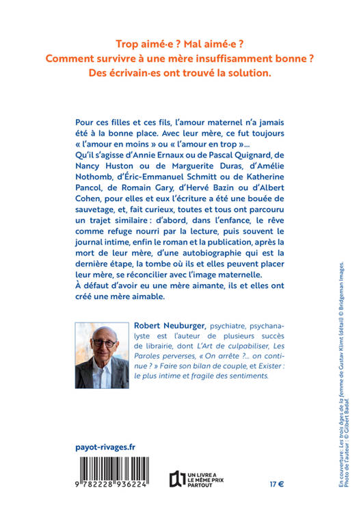 Trop aimé.e ? Pas assez ? Comment survivre à une mère insuffisamment bonne ? Des écrivains ont trouvé la solution. Annie Ernaux, Nancy Huston, Delphine le Vigan, Marguerite Duras, Pascal Quignard, Hervé Bazin, Simenon, Colette, Albert Cohen, Romain Gary, Saint- Exupéry, Amélie Nothomb, Eric-Emmanuel Schmitt, etc. : pour elles et eux, l'amour maternel n'a jamais été à la bonne place et ce fut un peu "l'amour en moins" ou "l'amour en trop"... La lecture et l'écriture ont été leur bouée de sauvetage. Fait curieux, après la mort de leur mère, ils ont tous écrit une autobiographie, comme la tombe où ils pouvaient placer leur mère, se réconcilier avec l'image maternelle. À défaut d'avoir eu une mère aimante, ils ont créé une mère aimable.
