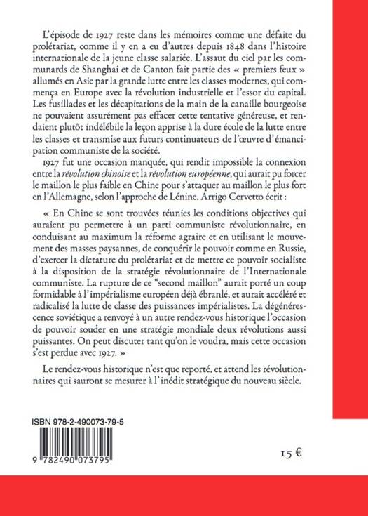 L’épisode de 1927 reste dans les mémoires comme une défaite du prolétariat, comme il y en a eu d’autres depuis 1848 dans l’histoire internationale de la jeune classe salariée. L’assaut du ciel par les communards de Shanghai et de Canton fait partie des « premiers feux » allumés en Asie par la grande lutte entre les classes modernes, qui commença en Europe avec la révolution industrielle et l’essor du capital. Les fusillades et les décapitations de la main de la canaille bourgeoise ne pouvaient assurément pas effacer cette tentative généreuse, et rendaient plutôt indélébile la leçon apprise à la dure école de la lutte entre les classes et transmise aux futurs continuateurs de l’œuvre d’émancipation communiste de la société. 1927 fut une occasion manquée, qui rendit impossible la connexion entre la révolution chinoise et la révolution européenne, qui aurait pu forcer le maillon le plus faible en Chine pour s’attaquer au maillon le plus fort en l’Allemagne, selon l’approche de Lénine. Arrigo Cervetto écrit : « En Chine se sont trouvées réunies les conditions objectives qui auraient pu permettre à un parti communiste révolutionnaire, en conduisant au maximum la réforme agraire et en utilisant le mouvement des masses paysannes, de conquérir le pouvoir comme en Russie, d’exercer la dictature du prolétariat et de mettre ce pouvoir socialiste à la disposition de la stratégie révolutionnaire de l’Internationale communiste. La rupture de ce “second maillon” aurait porté un coup formidable à l’impérialisme européen déjà ébranlé, et aurait accéléré et radicalisé la lutte de classe des puissances impérialistes. La dégénérescence soviétique a renvoyé à un autre rendez-vous historique l’occasion de pouvoir souder en une stratégie mondiale deux révolutions aussi puissantes. On peut discuter tant qu’on le voudra, mais cette occasion s’est perdue avec 1927. » Le rendez-vous historique n’est que reporté, et attend les révolutionnaires qui sauront se mesurer à l’inédit stratégique du nouveau siècle.
