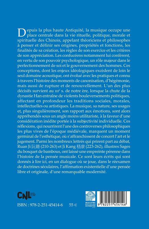 Depuis la plus haute Antiquité, la musique occupe une place centrale dans la vie rituelle, politique, morale et spirituelle des Chinois, appelant théoriciens et philosophes à penser et définir ses origines, propriétés et fonctions, les finalités de sa création, les règles de son exercice et les critères de son appréciation. Les confucéens notamment lui confèrent, en vertu de son pouvoir psychologique, un rôle majeur dans le perfectionnement de soi et le gouvernement des hommes. Ces conceptions, dont les enjeux idéologiques excèdent de loin le seul domaine acoustique, ont évolué avec les pratiques et connu à travers l’histoire des moments de canonisation, d’hégémonie, mais aussi de rupture et de renouvellement. L’un des plus décisifs survient au IIIe s. de notre ère, lorsque la chute de la dynastie Han entraîne de violents bouleversements politiques, affectant en profondeur les traditions sociales, morales, intellectuelles ou artistiques. La musique, sa nature, ses usages et, plus singulièrement, son rapport aux émotions, sont alors appréhendés sous un angle moins utilitariste, à la faveur d’une considération inédite portée à la subjectivité individuelle. Ces réflexions, qui nourrirent l’une des controverses philosophiques les plus vives de l’époque médiévale, marquent un moment germinal de l’esthétique, où s’affranchissent de concert l’art et le jugement. Parmi les nombreux lettrés qui prirent part au débat, Ruan Ji 阮籍 (210-263) et Ji Kang 嵇康 (223-262), illustres Sages du bosquet de bambous, ont laissé une empreinte pérenne dans l’histoire de la pensée musicale. Ce sont leurs écrits qui sont donnés à lire ici, en un dialogue où se joue, dans le réexamen de doctrines séculaires, l’affirmation existentielle d’une pensée libre et originale, d’une remarquable modernité.