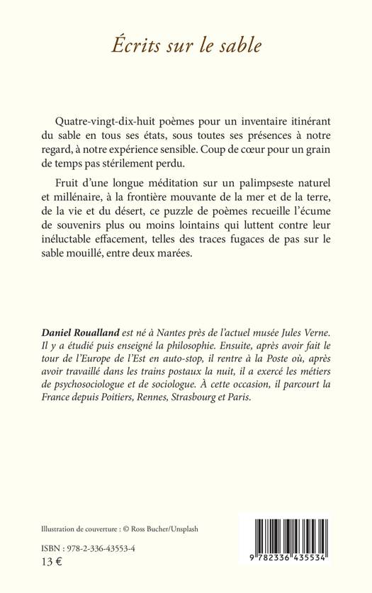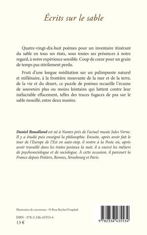 Quatre-vingt-dix-huit poèmes pour un inventaire itinérant du sable en tous ses états, sous toutes ses présences à notre regard, à notre expérience sensible. Coup de coeur pour un grain de temps pas stérilement perdu. Fruit d'une longue méditation sur un palimpseste naturel et millénaire, à la frontière mouvante de la mer et de la terre, de la vie et du désert, ce puzzle de poèmes recueille l'écume de souvenirs plus ou moins lointains qui luttent contre leur inéluctable effacement, telles des traces fugaces de pas sur le sable mouillé, entre deux marées.