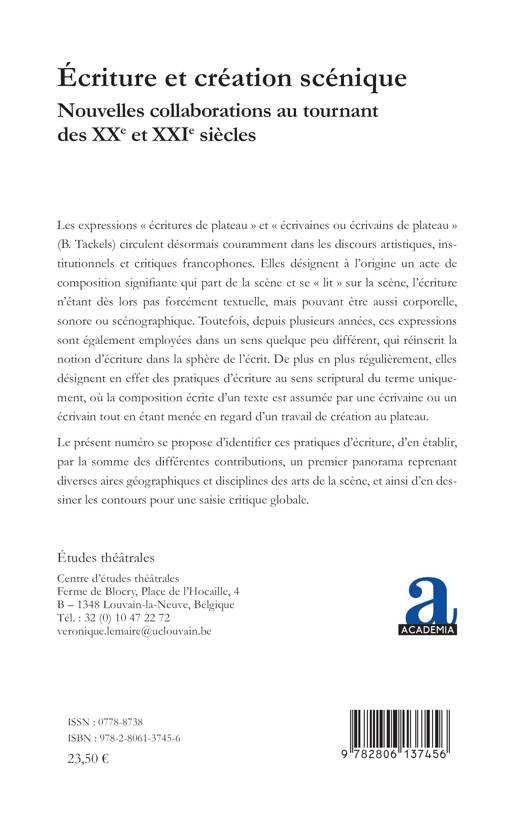 Les expressions écritures de plateau et écrivaines ou écrivains de plateau (B. Tackels) circulent désormais couramment dans les discours artistiques, institutionnels et critiques francophones. Elles désignent à l'origine un acte de composition signifiante qui part de la scène et se lit sur la scène, l'écriture n'étant dès lors pas forcément textuelle, mais pouvant être aussi corporelle, sonore ou scénographique. Toutefois, depuis plusieurs années, ces expressions sont également employées dans un sens quelque peu différent, qui réinscrit la notion d'écriture dans la sphère de l'écrit. De plus en plus régulièrement, elles désignent en effet des pratiques d'écriture au sens scriptural du terme uniquement, où la composition écrite d'un texte est assumée par une écrivaine ou un écrivain tout en étant menée en regard d'un travail de création au plateau.