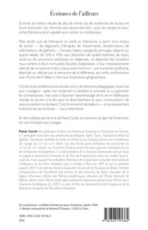 L'auteur écrit sa fascination pour les voyages et pour ces écrits qu’on appelle aussi viatiques ou hodéporiques à partir d’un corpus de textes de négociants, d’émigrés, de missionnaires, d’explorateurs, de colonisateurs, de galériens français, italiens, espagnols, portugais, répartis sur quatre siècles, de 1343 à 1750. Et ce sans distinction de qualité littéraire, de statut social ou de convictions politiques ou religieuses. Le livre de Paolo Carile, qui examine ce logos de l’itinérance, est une invitation aux voyages.