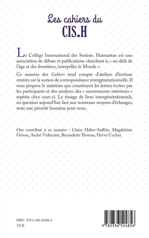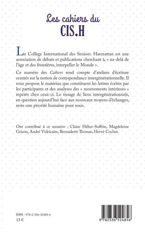 Le Collège International des Seniors. Harmattan est une association de débats et publications cherchant à, au-delà de l'âge et des frontières, interpeller le Monde . Ce numéro des Cahiers rend compte d'ateliers d'écriture centrés sur la notion de correspondance intergénérationnelle. Il vous propose le matériau que constituent les lettres écrites par les participants et des analyses des mouvements intérieurs repérés chez ceux-ci. Le tissage de liens intergénérationnels, en question aujourd'hui face aux nouveaux moyens d'échange, reste une priorité humaine pour nous.