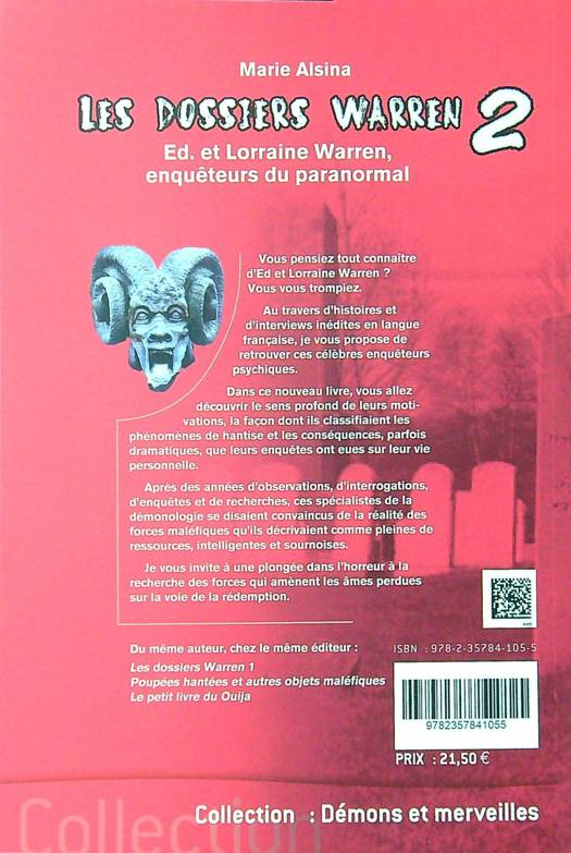 Vous pensiez tout connaître d’Ed et Lorraine Warren ? Vous vous trompiez. Au travers d’histoires et d’interviews inédites en langue française, je vous propose de retrouver ces célèbres enquêteurs psychiques. Dans ce nouveau livre, vous allez découvrir le sens profond de leurs motivations, la façon dont ils classifiaient les phénomènes de hantise et les conséquences, parfois dramatiques, que leurs enquêtes ont eues sur leur vie personnelle. Après des années d’observations, d’interrogations, d’enquêtes et de recherches, ces spécialistes de la démonologie se disaient convaincus de la réalité des forces maléfiques. Ils les décrivaient comme pleines de ressources, intelligentes et sournoises. Je vous invite à une plongée dans l’horreur à la recherche des forces qui amènent les âmes perdues sur la voie de la rédemption.