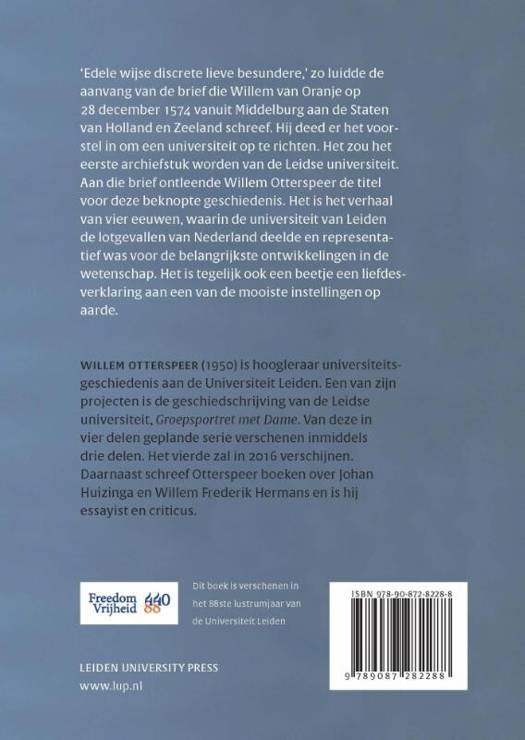 'Edele wijse discrete lieve besundere,' zo luidde de aanvang van de brief die Willem van Oranje op 28 december 1574 vanuit Middelburg aan de Staten van Holland en Zeeland schreef. Hij deed er het voorstel in om een universiteit op te richten. Het zou het eerste archiefstuk worden van de Leidse universiteit. Aan die brief ontleende Willem Otterspeer de titel voor deze beknopte geschiedenis. Het is het verhaal van vier eeuwen, waarin de universiteit van Leiden de lotgevallen van Nederland deelde en representatief was voor de belangrijkste ontwikkelingen in de wetenschap. Het is tegelijk ook een beetje een liefdesverklaring aan een van de mooiste instellingen op aarde.