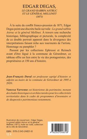À la suite du conflit franco-prussien de 1871, Edgar Degas peint une discrète huile sur toile : Le grand rabbin Astruc et le général Mellinet. À travers une recherche historique, bibliographique et picturale, la complexité de ce double portrait apparait dans la divergence des interprétations faisant écho aux tourments de l’artiste. Hommage ou pamphlet ? Passant par les collections Ephrussi et Reinach avant d’être légué à la commune de Gérardmer, ce tableau offre un lien entre la vie des protagonistes, des propriétaires et 150 ans d’histoire.
