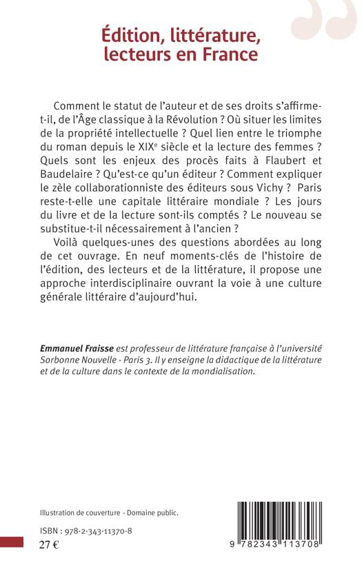 Comment le statut de l'auteur et de ses droits s'affirme-t-il, de l'Âge classique à la Révolution? Où situer les limites de la propriété intellectuelle? Quel lien entre le triomphe du roman depuis le XIXe siècle et la lecture des femmes? Quels sont les enjeux des procès faits à Flaubert et Baudelaire. Qu'est-ce qu'un éditeur? Comment expliquer le zèle collaborationniste des éditeurs sous Vichy? Paris reste-elle une capitale littéraire mondiale? Les jours du livre et de la lecture sont-ils comptés? L'auteur propose une approche interdisciplinaire ouvrant la voie à une culture générale littéraire d'aujourd'hui.