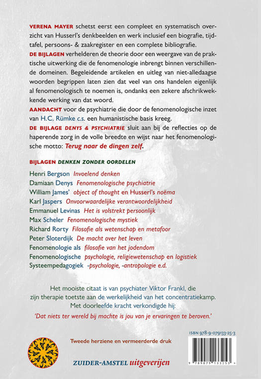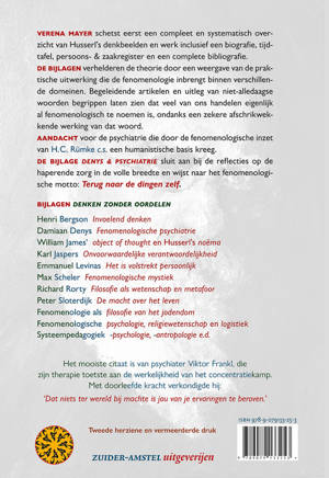 Husserl's motto Zu den Sachen selbst vraagt om een evenwichtige denkgeest. De fenomenologische methode heeft vele sporen achtergelaten: in de filosofie van de geest, de relatie denken-taal-communicatie, pedagogiek en in de esthetica.1 Deze herkenning betekent dat leiderschap reflectie en distantie vereist, dat wijsheid voorbij kennis ligt, dat ruimte geven, echt luisteren en samenhangen ontdekken een bruikbare competentie is op fenomenologische basis. Verena Mayer schetst in deel 1 een diepgaand overzicht van Husserl's denkbeelden. De bijlagen in deel 2 (toegevoegd aan de Nederlandse uitgave) schetsen een gevarieerd beeld van het praktische nut van de methode in verschillende situaties in allerlei vormen binnen de verschillende stromingen van het fenomenologische domein. Begeleidende artikelen en uitleg van onalledaagse begrippen verhelderen de methode. Duidelijk wordt dat veel van ons handelen eigenlijk al fenomenologisch te noemen is, ondanks een zekere afschrikwekkende werking van dat woord. Kernbegrip is aandachtig luisteren en aanschouwen zonder ballast. Het vooruitschuiven van een oordeel is het 'filtrum' van de fenomenologie: de oordeelsbehoefte verzwakt in de harmonie van de aangevoelde weerglans die op strenge wijze terugverwijst naar waar het werkelijk om draait. Ook als er uiteindelijk een beslissing wordt genomen. Geen hamerstuk louter aan de hand van abstracties. Administratieve 'sorteermachines' nemen 'beslissingen' en het streven om menselijke capaciteit beter te benutten, sneeuwde onder in een markt waar mensen en machines inwisselbaar zijn. Er is altijd meer over te zeggen en oplossen is samenwerken. Fenomenologische invalshoeken, al of niet onder dat predicaat, denken mee aan de aanpassingen die evident zijn om in een snel veranderende wereld te kunnen leven, desnoods te overleven. Zet je schrap. Het Fenomenologenlied klinkt pas op bladzijde 182.
