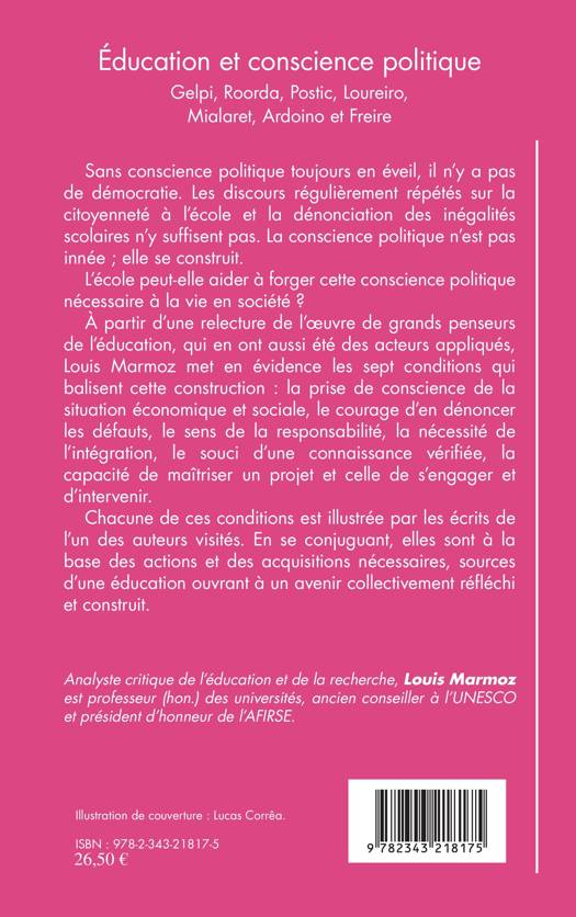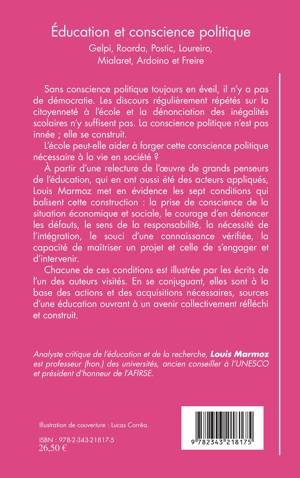 Sans conscience politique toujours en éveil, il n'y a pas de démocratie. Les discours régulièrement répétés sur la citoyenneté à l'école et la dénonciation des inégalités scolaires n'y suf¬fisent pas. La conscience politique n'est pas innée ; elle se construit. L'école peut-elle aider à forger cette conscience politique nécessaire à la vie en société ? À partir d'une relecture de l'uvre de grands penseurs de l'éducation, qui en ont aussi été des acteurs appliqués, Louis Marmoz met en évidence les sept conditions qui balisent cette construction : la prise de conscience de la situation économique et sociale, le courage d'en dénoncer les défauts, le sens de la responsabilité, la nécessité de l'intégration, le souci d'une connaissance vérifiée, la capacité de maîtriser un projet et celle de s'engager et d'intervenir.