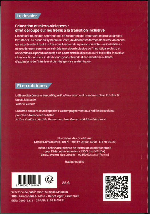 Ce dossier réunit des contributions de recherche qui entendent mettre en lumière l’existence, au coeur du système éducatif, de différentes formes de micro-violences, qui se présentent tout à la fois sous l’aspect d’un poison invisible – ou invisibilisé – et fonctionnent comme un frein à la transition inclusive de l’institution scolaire et universitaire. Il part du constat d’un écart entre le discours sur l’école dite inclusive et un fonctionnement institutionnel générateur de discriminations subtiles, d’exclusions de l’intérieur et de négligences systémiques.