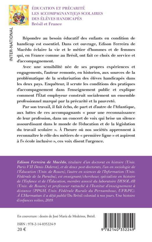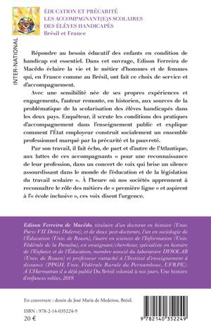 Répondre au besoin éducatif des enfants en condition de handicap est essentiel. Dans cet ouvrage, Edison Ferreira de Macêdo éclaire la vie et le métier d'hommes et de femmes qui, en France comme au Brésil, ont fait ce choix de service et d'accompagnement. Avec une sensibilité née de ses propres expériences et engagements, l'auteur remonte, en historien, aux sources de la problématique de la scolarisation des élèves handicapés dans les deux pays. Enquêteur, il scrute les conditions des pratiques d'accompagnement dans l'enseignement public et explique comment l'État employeur construit socialement un ensemble professionnel marqué par la précarité et la pauvreté. Par son travail, il fait écho, de part et d'autre de l'Atlantique, aux luttes de ces accompagnants pour une reconnaissance de leur profession, dans un concert de voix qui brise un silence assourdissant dans le monde de l'éducation et de la législation du travail scolaire . À l'heure où nos sociétés apprennent à reconnaître le rôle des métiers de première ligne et aspirent à l' école inclusive, ces voix disent l'urgence.