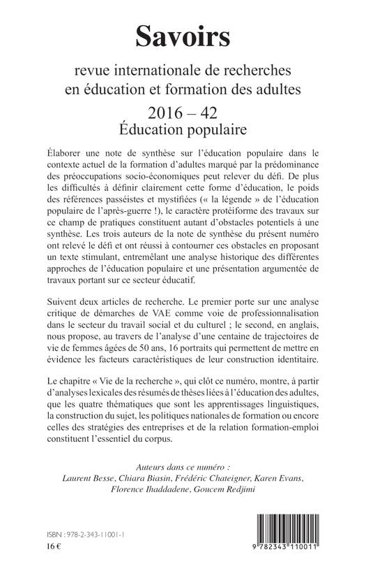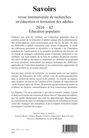 Élaborer une note de synthèse sur l'éducation populaire peut relever du défi. Les difficultés à définir clairement cette forme d'éducation, le poids des références mythifiées, le caractère protéiforme des travaux sur ce champ de pratiques, constituent autant d'obstacles potentiels à une synthèse. Les auteurs du présent numéro ont relevé le défi et ont réussi à contourner ces obstacles en proposant un texte stimulant et argumenté. Suivent deux articles de recherche (dont un en anglais), ainsi qu'un chapitre présentant les actualités de la recherche en éducation et formation des adultes.